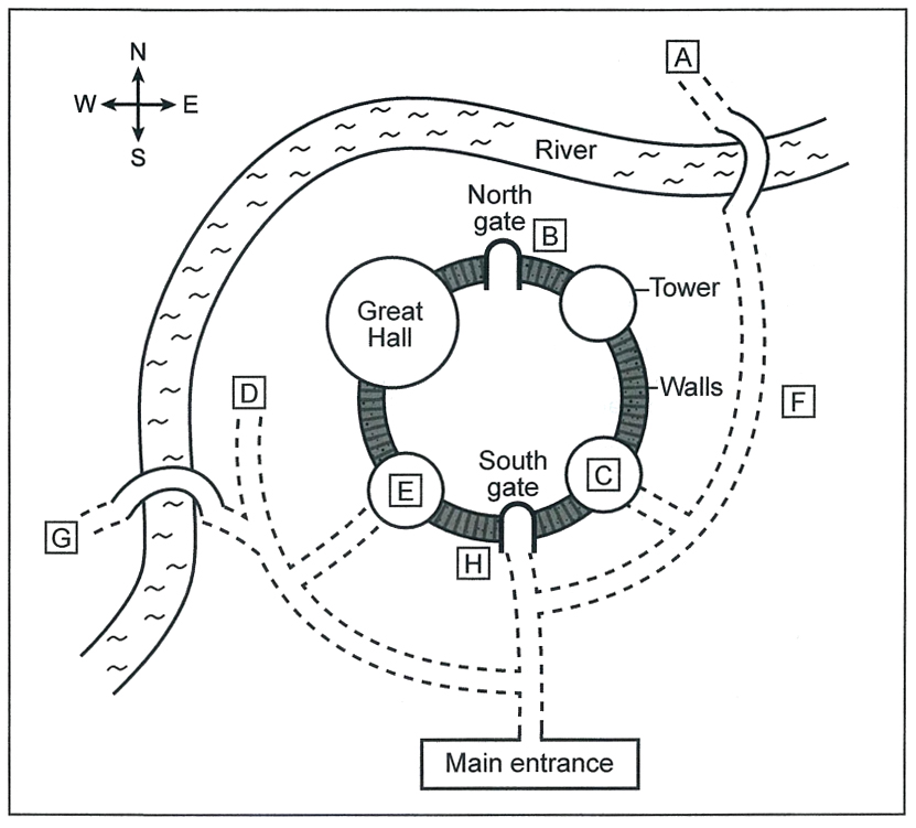 If you want to get a good view of the whole castle, you can walk around the walls. (Q16) The starting point’s quite near the main entrance – walk straight down the path until you get to the south gate, and it’s just there. Don’t go on to the north gate – there’s no way up from there.