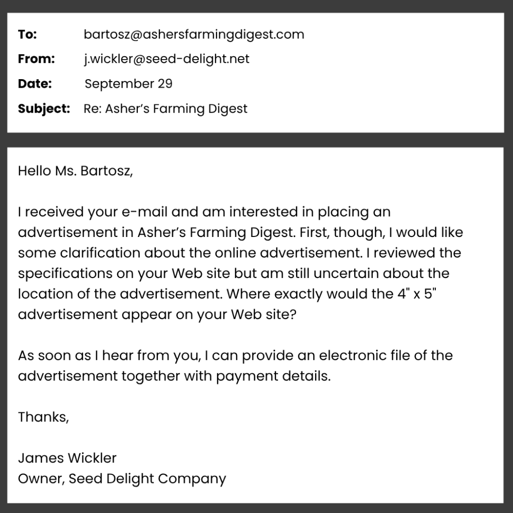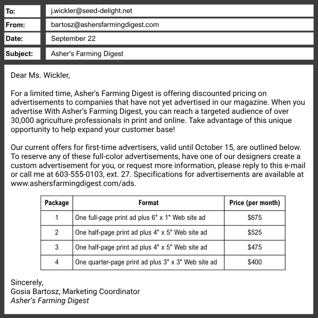 Dẫn chứng: Ông Wickler hỏi về quảng cáo 4” x 5” trên web. Trong bảng giá, Package 2 có quảng cáo web đúng kích thước này.