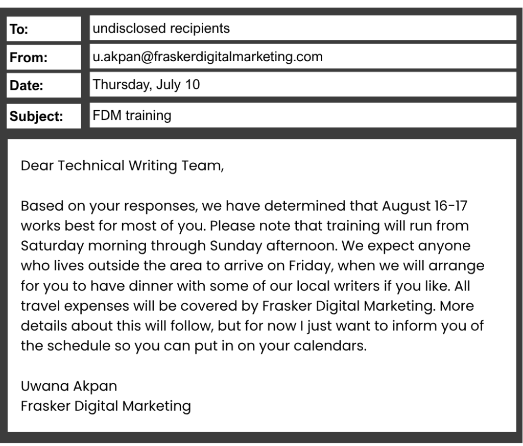 Giải thích: Vì tập huấn bắt đầu 16/8, nên Ms. Bonsky sẽ đi đến Albany ngày 15/8.