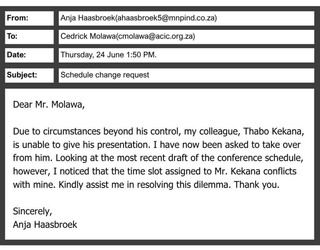 Dẫn chứng: Thabo Kekana dự kiến nói về Packaging Strategies for Product Shipping. Ms. Haasbroek được yêu cầu thay thế nên sẽ nói về chủ đề này.