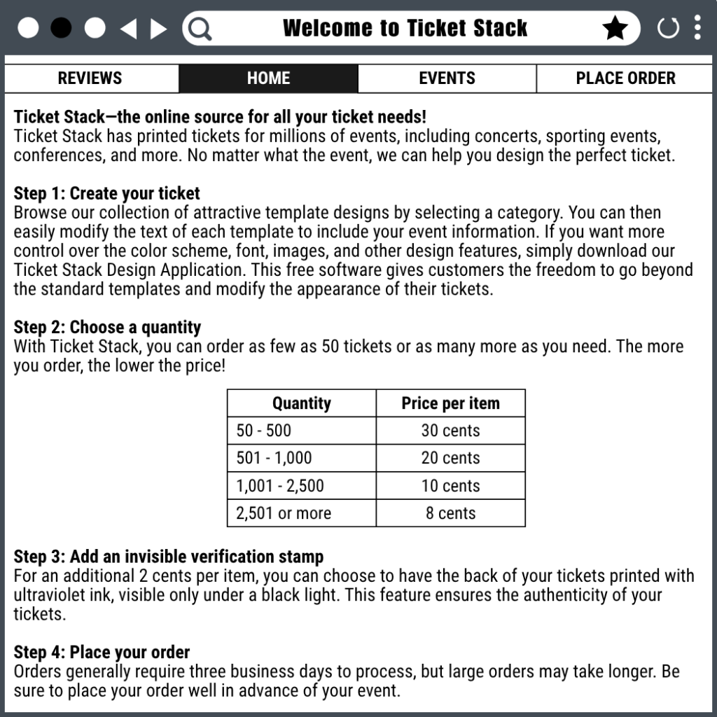 “We recently ordered 2,500 tickets from Ticket Stack.” (Theo bảng giá, 1,001–2,500 vé: 10 cents/vé.) Ông đặt 2,500 vé nên giá mỗi vé là 10 cents.
