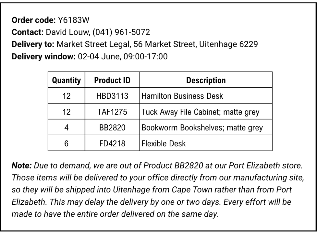 Đồ sẽ chuyển từ Cape Town vì hết hàng tại kho Port Elizabeth.
