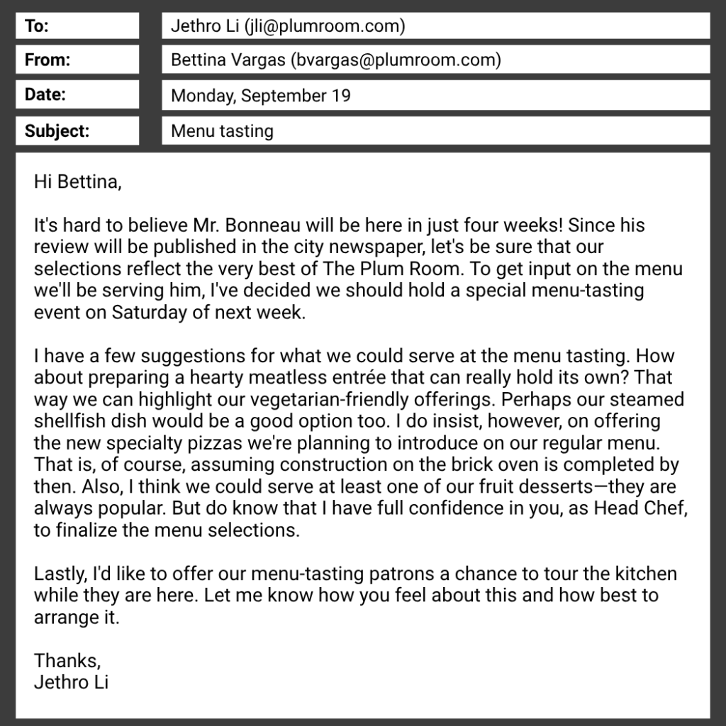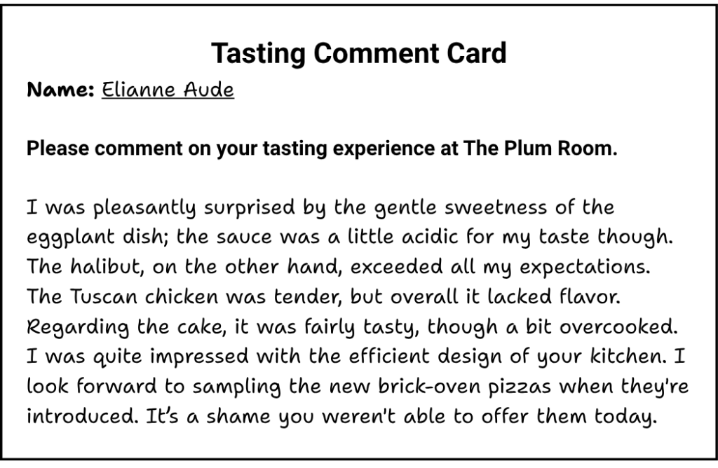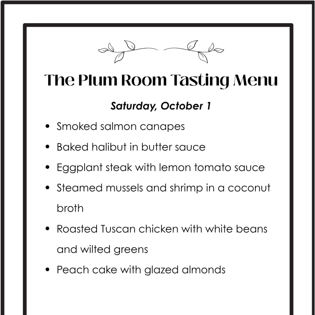 “Since his review will be published in the city newspaper, let’s be sure that our selections reflect the very best of The Plum Room.”