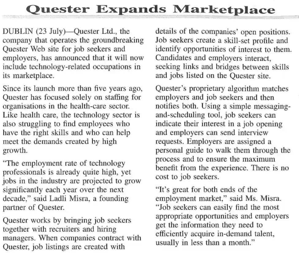 “Quester Ltd., the company that operates the groundbreaking Quester Web site for job seekers and employers…”
